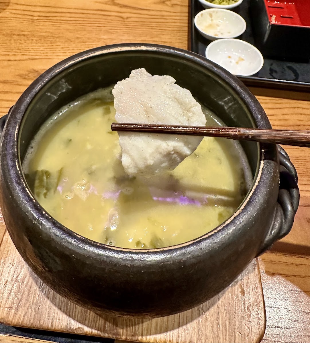 I happened to walk by this place and chose to eat here because I didn't know what to eat. There wasn't many people inside when I went because it was only 5pm so still early. We were seated quickly and ordered the original pork broth crossing noodle. They were served pretty quick and they gave us cups of tea while we waited. The crossing noodle comes with small dishes of ingredients to put inside the broth along with the rice noodles. I wish the portion of those ingredients were a bit bigger though. The rice noodle portion was really big so I didn't end up getting any refills but this place does have unlimited refills of noodles which is super nice. The broth was also very good and rich, perfect for the cold day. But as I was eating, I noticed the stone pot was leaking my soup. Luckily I saw it in time and asked the employee to help change. They changed it fast so it didn't interrupt my meal. Overall, this is a great place to eat rice noodles and tastes pretty authentic to me. The broth is rice and there is unlimited rice noodle refills. I recommend this place if you are in the area and want some good rice noodles.